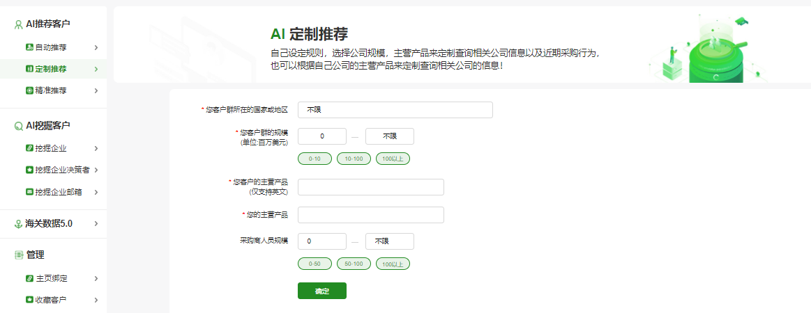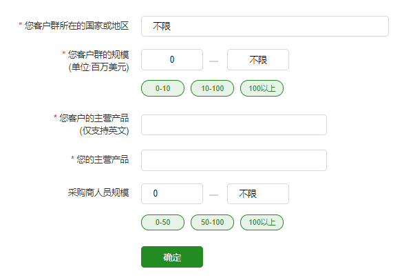 可自主設定規則,包括客戶(hù)群所在的國家或地區、客戶(hù)群規模、客戶(hù)主營(yíng)產(chǎn)品、自己的主營(yíng)產(chǎn)品等。