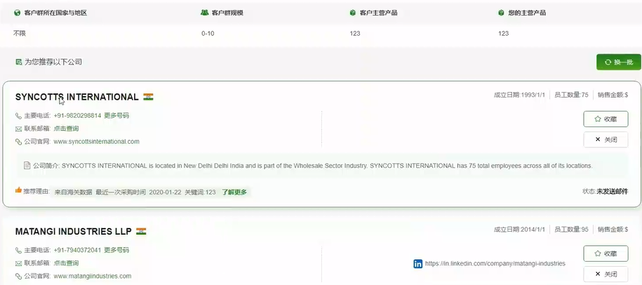 查詢(xún)結果顯示100條,可點(diǎn)擊換一批。展示內容包括公司名稱(chēng)、成立時(shí)間、員工數量、銷(xiāo)售金額、聯(lián)系方式等基礎信息。詳細內容可點(diǎn)擊進(jìn)入落地頁(yè)進(jìn)一步了解查看。