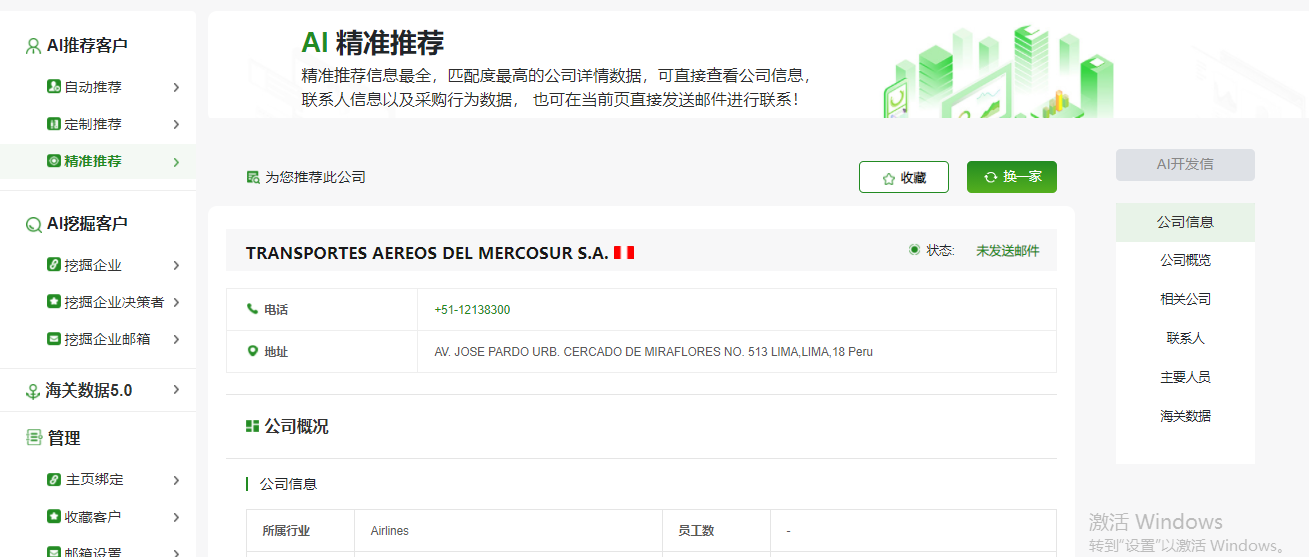 3、精準推薦:精準推薦信息最全,匹配度最高的單個(gè)公司詳情數據,直接展示落地頁(yè)??芍苯硬榭垂拘畔?,聯(lián)系人信息以及采購行為數據, 也可在當前頁(yè)直接發(fā)送郵件進(jìn)行聯(lián)系,可點(diǎn)擊換一批更換公司查看。