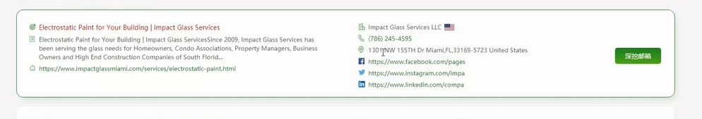 (2)搜索結果信息豐富,支持深挖郵箱:網(wǎng)站標題、描述、網(wǎng)址、公司全稱(chēng)、聯(lián)系電話(huà)、公司地址、SNS信息