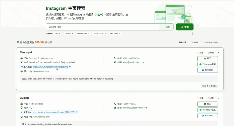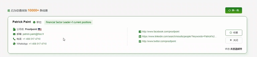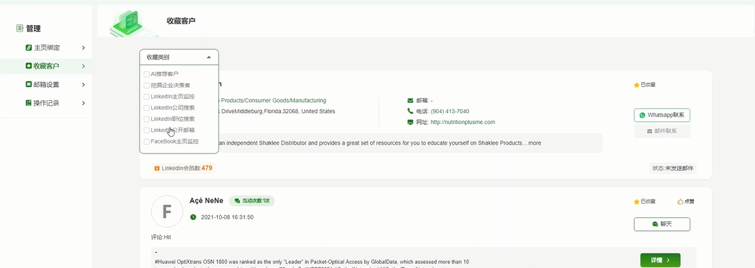 1、綜合了Linkedin,Facebook ,Instagram三家數據,5億+ 數據隨心獲客。支持一鍵WhatsApp聯(lián)系、發(fā)送郵件;支持社交平臺互動(dòng)跳轉(點(diǎn)贊等)