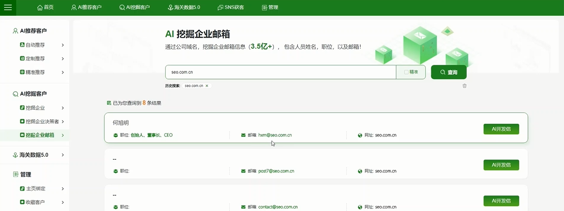 3、挖掘企業(yè)郵箱:通過(guò)公司域名,挖掘企業(yè)郵箱信息(3.5億+), 包含人員姓名,職位,以及郵箱!
