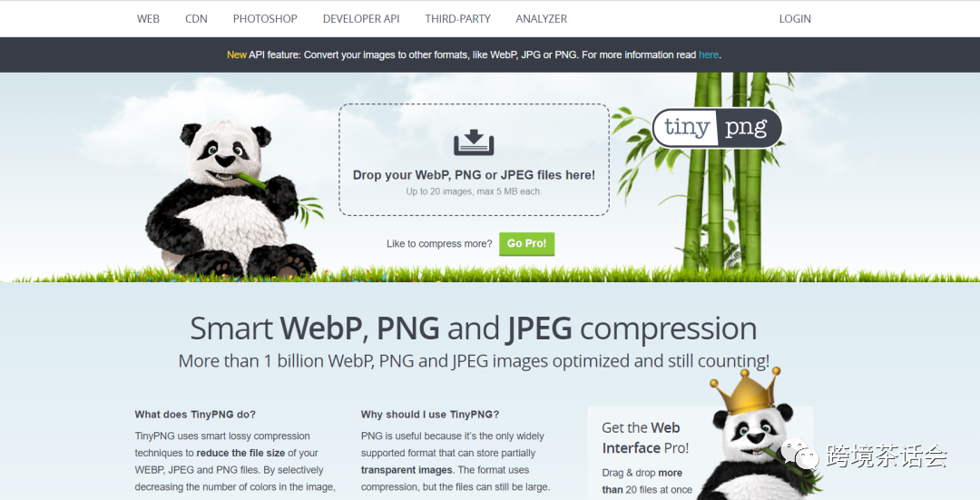 Tinypng 是一款在線(xiàn)圖片壓縮云應用,它使用智能壓縮技術(shù)來(lái)減小WebP、PNG和JPEG文件大小,讓存儲數據所需的字節更少,從而使得圖片壓縮后的效果和壓縮前基本一樣。