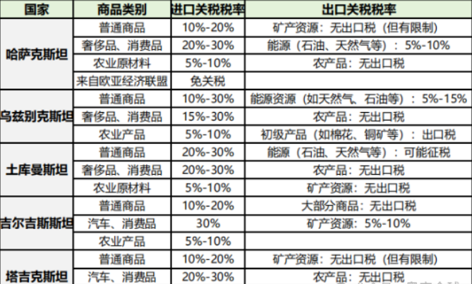 關(guān)稅稅率:一般來(lái)說(shuō),中亞國家對于進(jìn)口商品征收的關(guān)稅稅率較高,尤其是對非必需品、奢侈品和消費品,關(guān)稅稅率可能較高。對于農業(yè)產(chǎn)品、礦產(chǎn)資源和能源類(lèi)商品,通常征收較低的關(guān)稅或免稅。